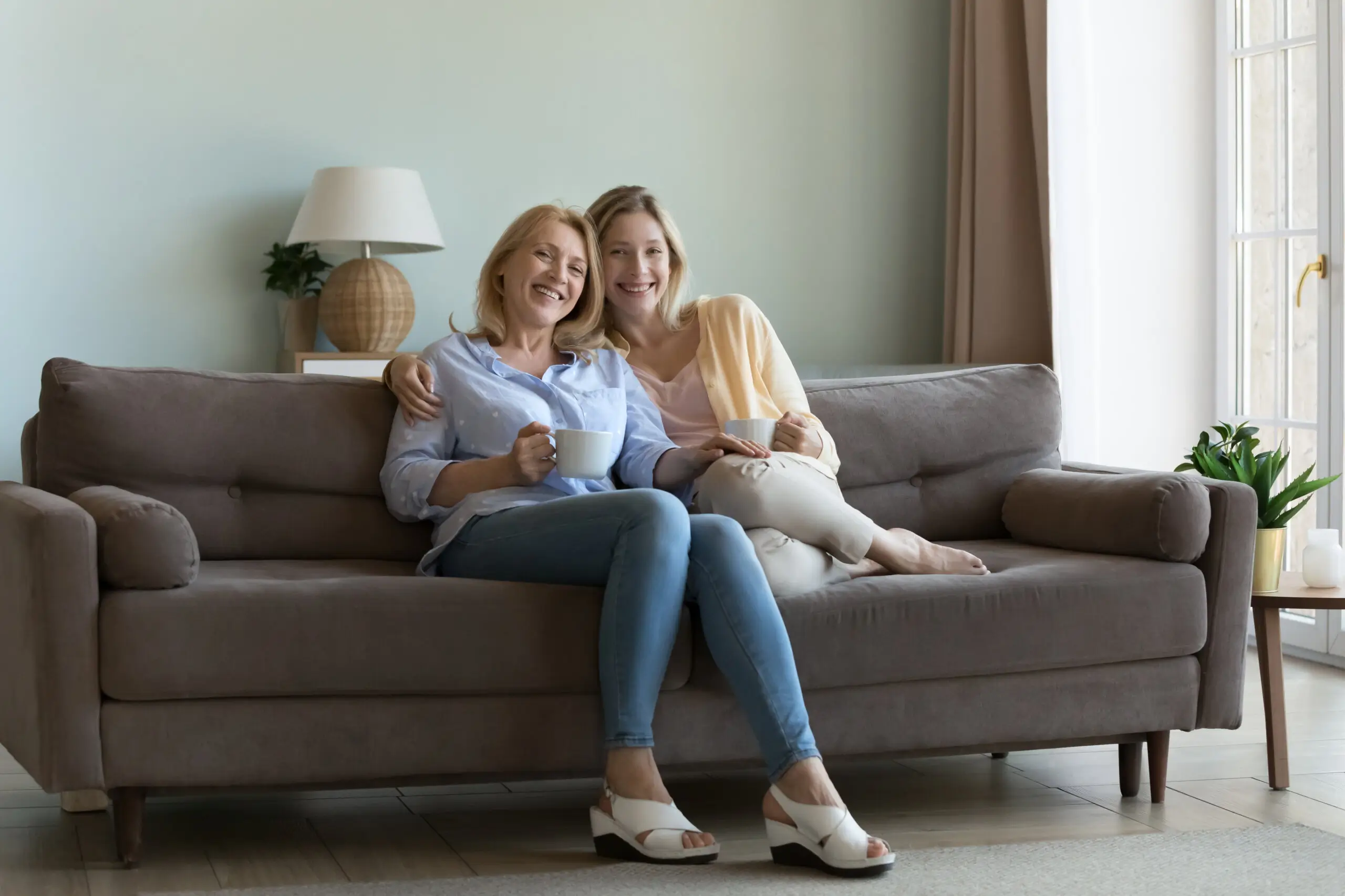 Two women sitting comfortably together on a sofa, smiling at the camera.